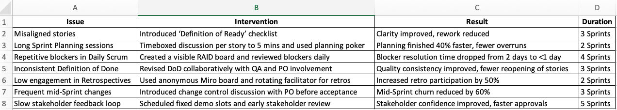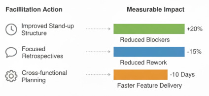 “I facilitated the retrospective where the team identified and fixed the QA bottleneck — saving us almost a full day per Sprint.”