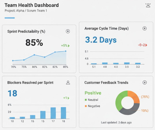 Walk through charts, highlight improvements, and tag stakeholders in Slack or Teams: “Quick summary of this Sprint’s progress — improved predictability by 18%.”