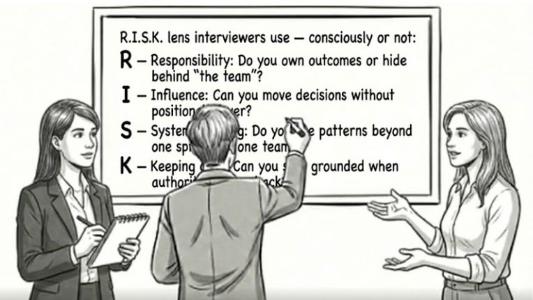 I often describe this to candidates as the R.I.S.K. lens interviewers use — consciously or not: