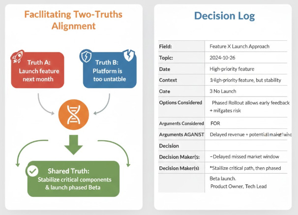 Your framing of invisible work as easily ignored work resonates deeply. The progression from ceremony facilitation to business impact mirrors what I've seen with effective technical leads too, tey shift from task execution to making architectural decisoins visible through ADRs and metric dashboards. What striked me was Strategy 04 on difficult conversations. The Two-Truths Alignment framework is elegant because it legitimizes both perspectives without forcing compromise, which most conflict resolution models actually demand.